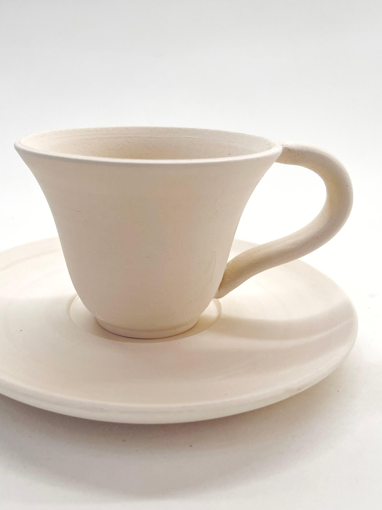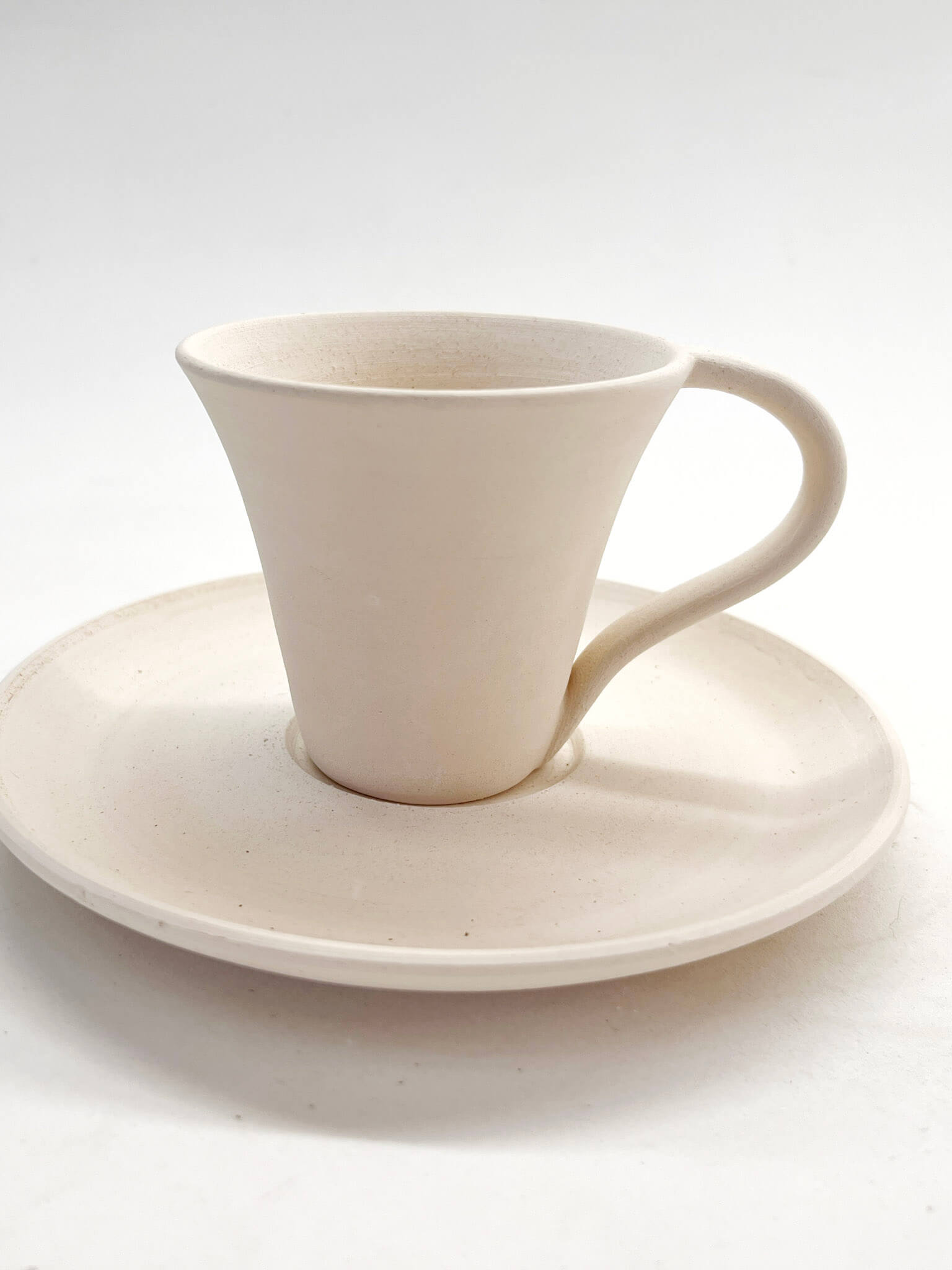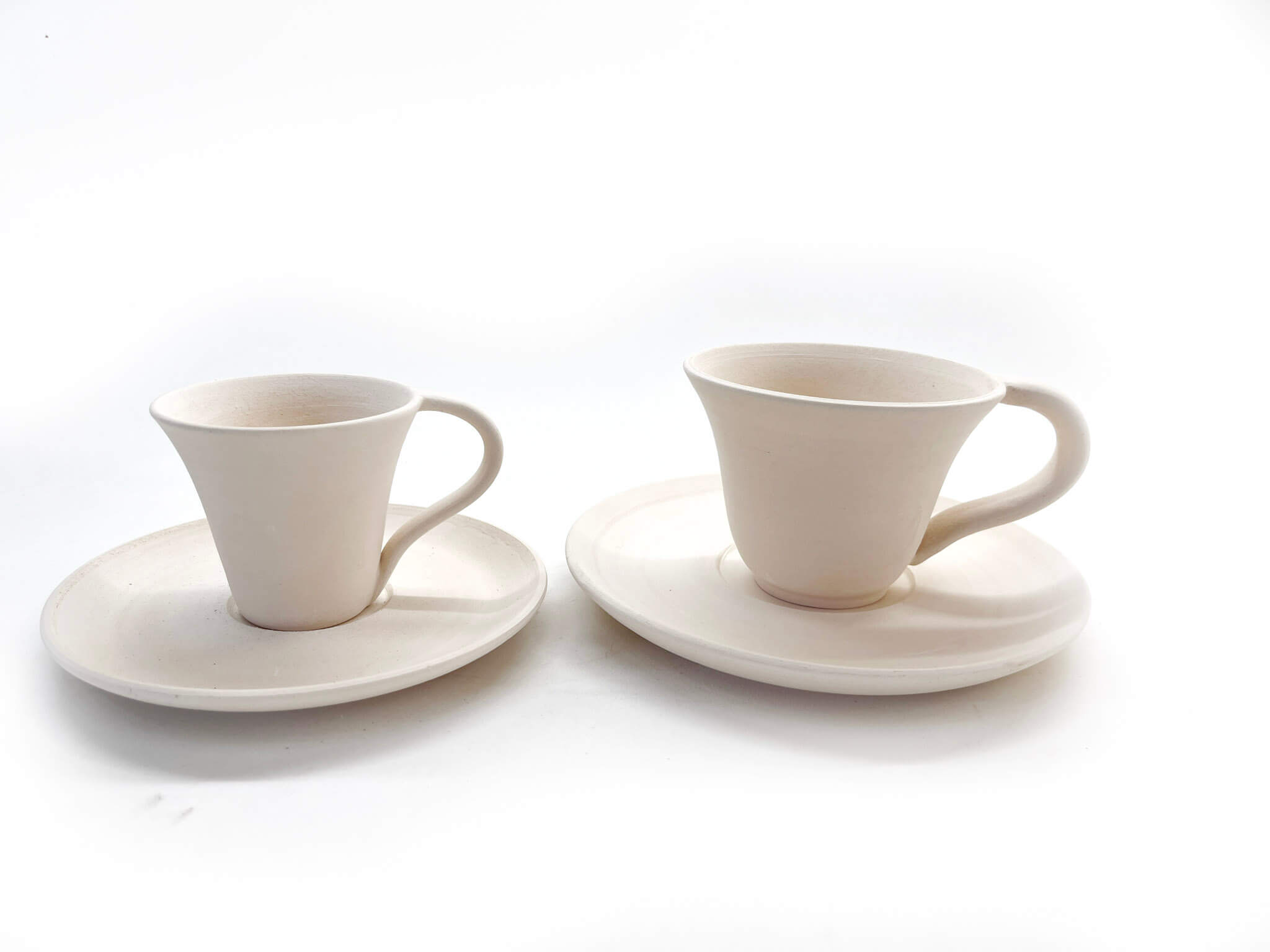 Os biscoitos para pintar são feitos com argila branca e argila de pintinhas (granito rústica). As peças são modeladas em torno e com placa, com paredes finas, uniformes e delicadas ao mesmo tempo que bem compactas pra evitar empenamento.